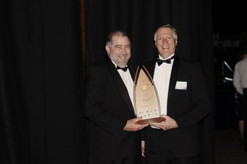 Malcolm de la Rosa (left) and Rolf Bybyk (right) accept Silverise's award in the Westen Australia Industry and Export Awards, 2 October 2009, at the Hyatt Regency, Perth, Western Australia.